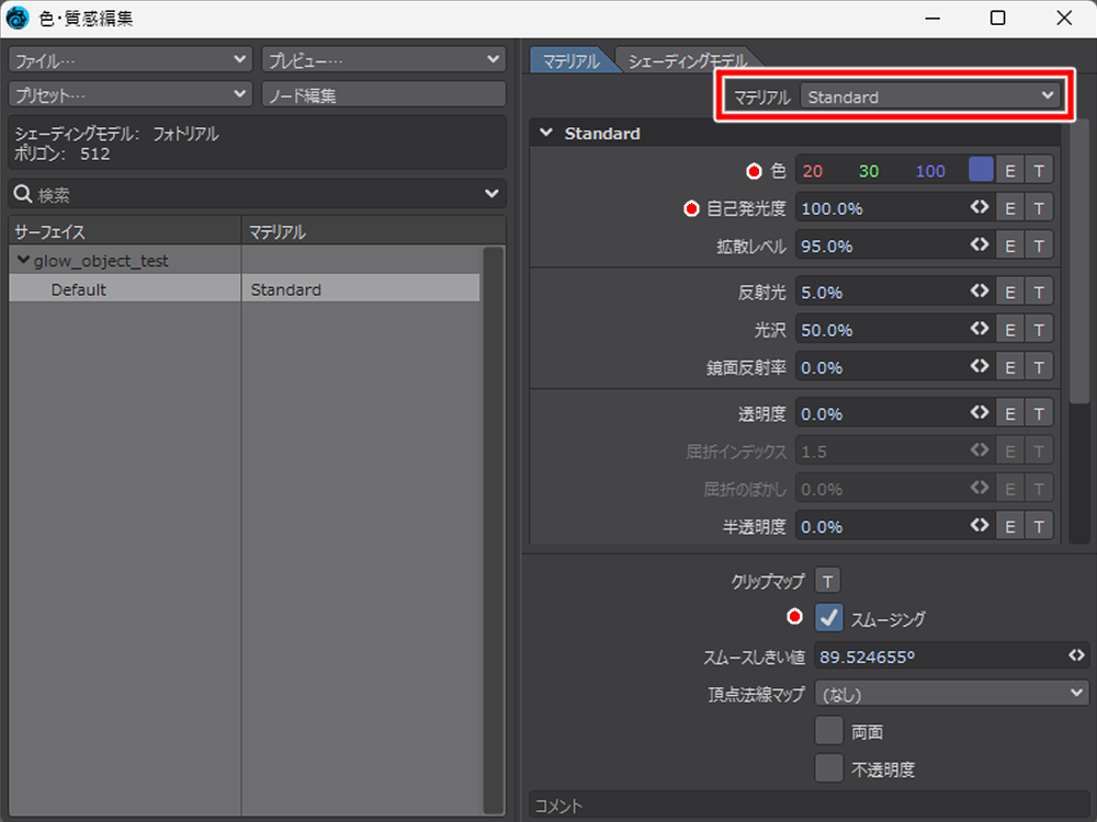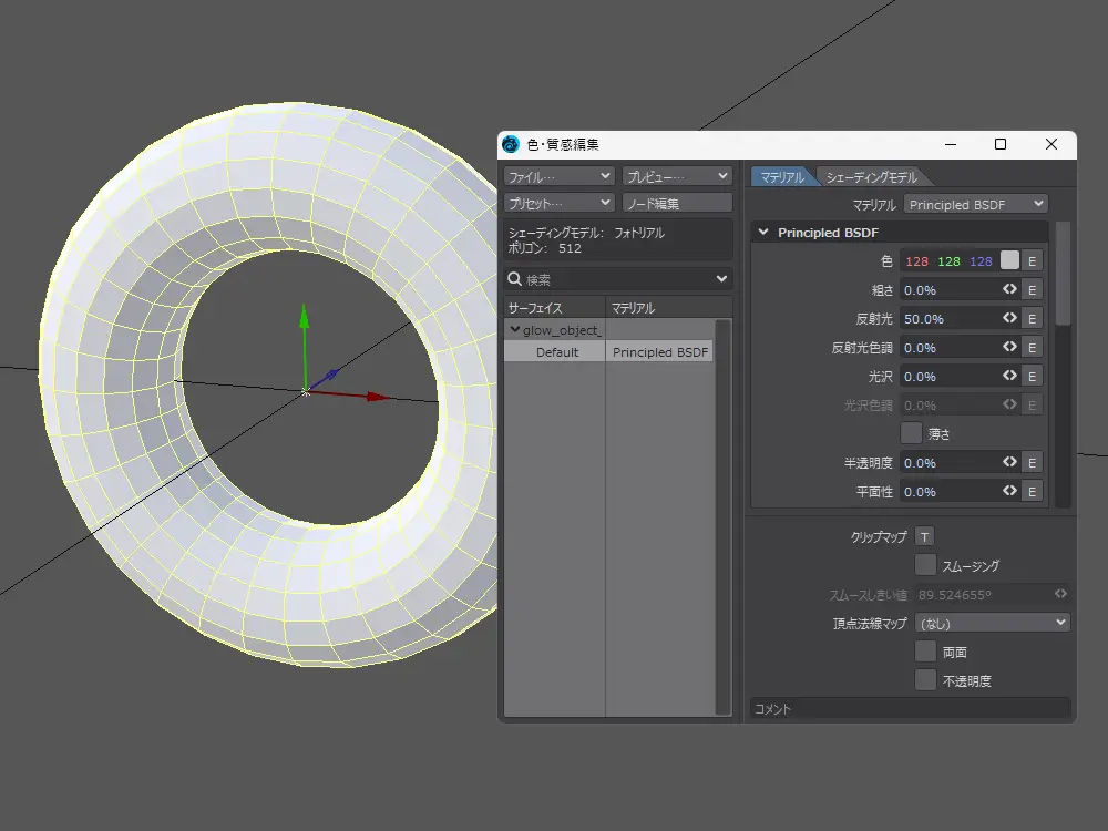 色・質感編集パネルを開いてマテリアルだったり、色や光の強さなど好きなように変更