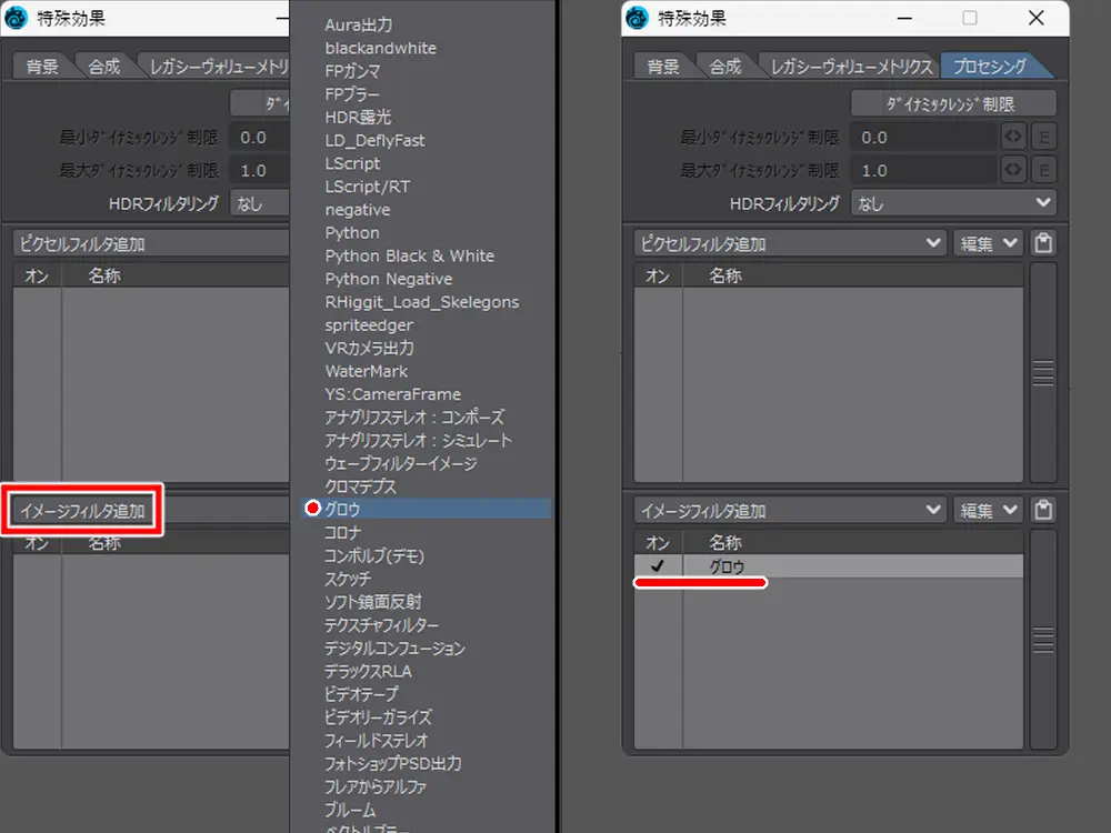 古いバージョンだと始めからグロウ項目が表に出ている状態でしたが、これが新しいバージョンでは「イメージフィルタ」の中に移動したようです