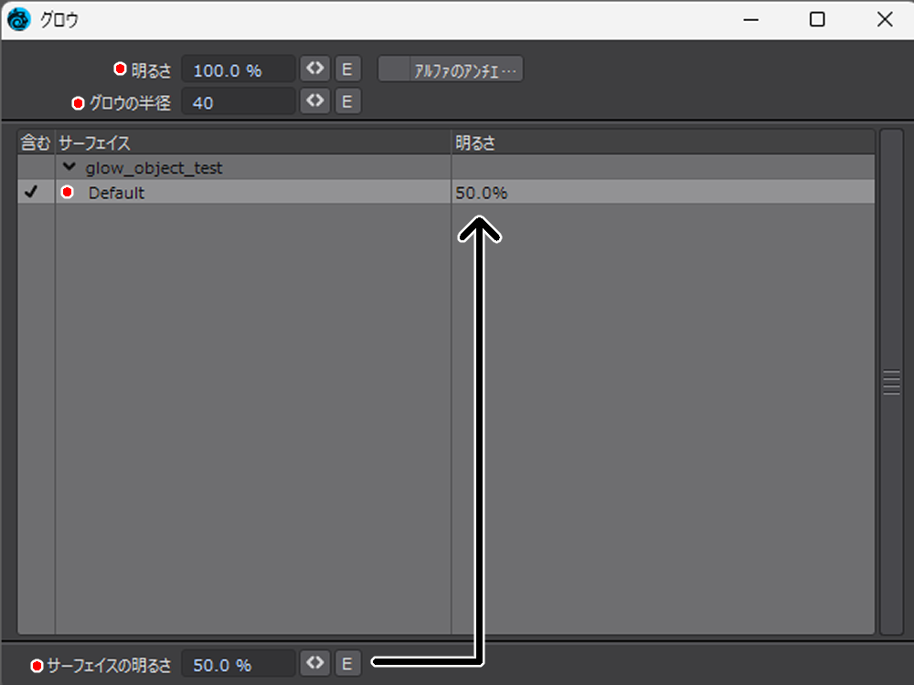 また、サーフェイスの明るさは黒矢印の値と連動しています