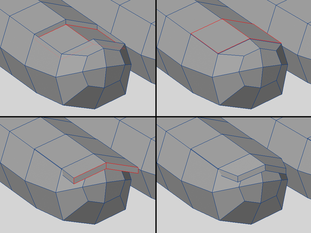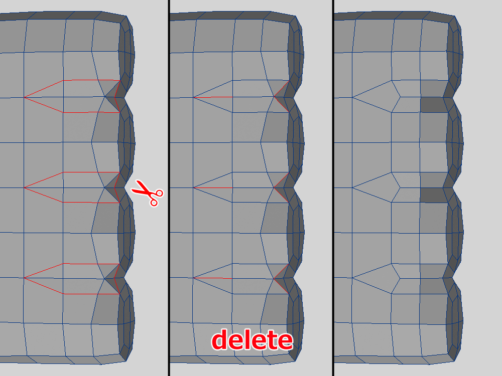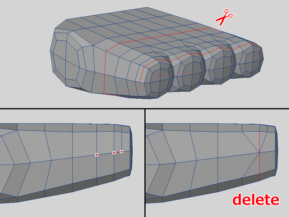 一旦いらないエッジを消して、画像右のように改めてカットを入れてポイント数とポリゴンの流れを変えます