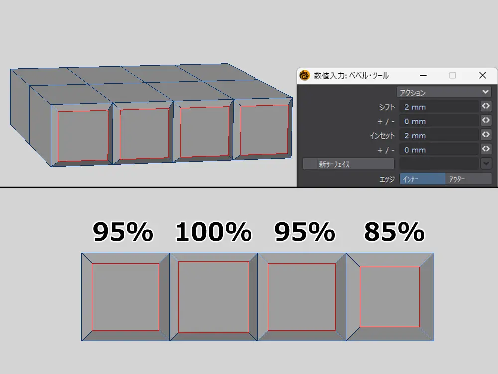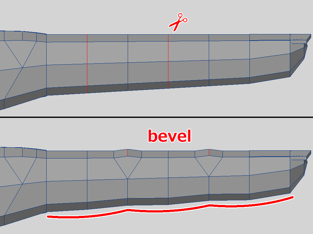 カットを増やして、関節部分のエッジにベベルをかけて関節を作成