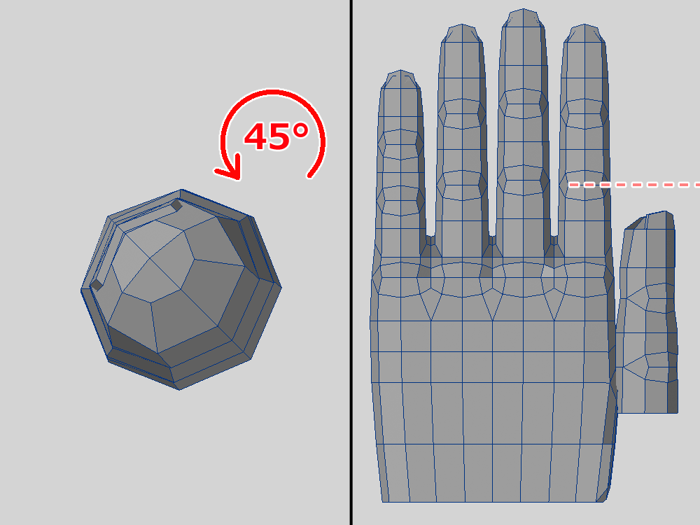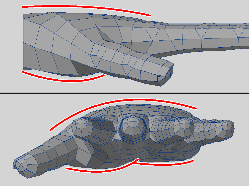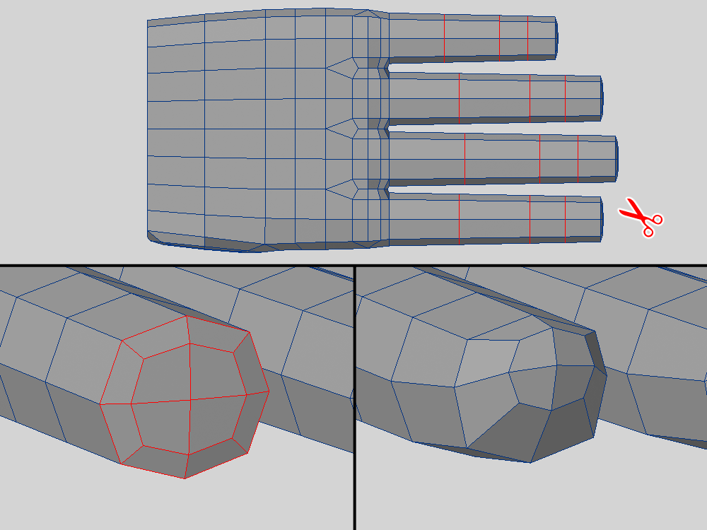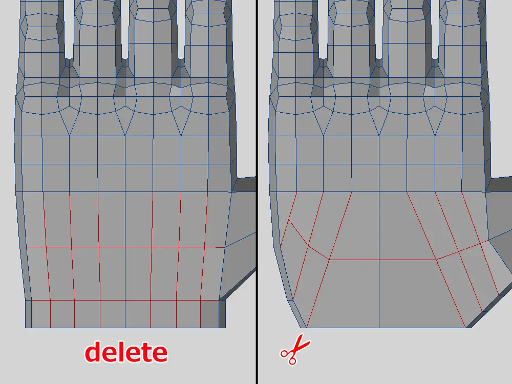 指の根元のエッジを広げて、曲げたときに自然な変形になるようにします