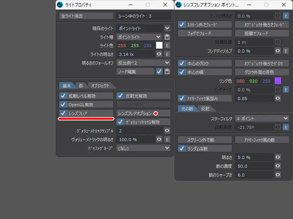 ライトプロパティの中にある「レンズフレア」を有効にすれば使えます